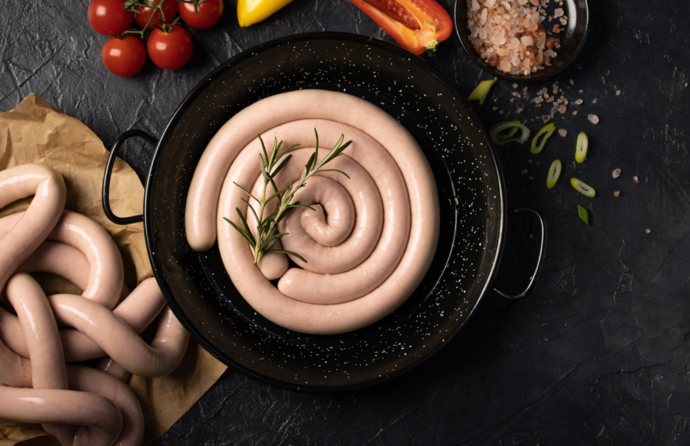 Krůtí maso 85 % z celkového obsahu masa, pitná voda, krůtí kůže, strouhanka (PŠENIČNÁ MOUKA, pitná voda, droždí), bílé víno 7 % (obsahuje SIŘIČITANY), MLÉKO, vepřové maso, vepřové sádlo, jedlá sůl s jodem (jodičnan draselný), koření, dextróza, bujón (koření, sůl, slunečnicový olej), stabilizátor: E451, regulátor kyselosti: E262, E300, antioxidant: E330, extrakty z koření, řepkový olej, skopové střevo.