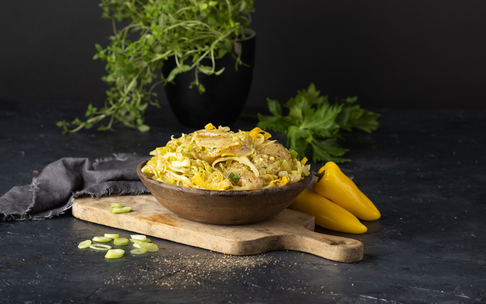 Sliced chicken pieces marinated in a curry spice marinade with slices of yellow pepper, cabbage, and leek. The product is marinated at the facility in Brniště. The chicken meat comes from leading Czech suppliers.