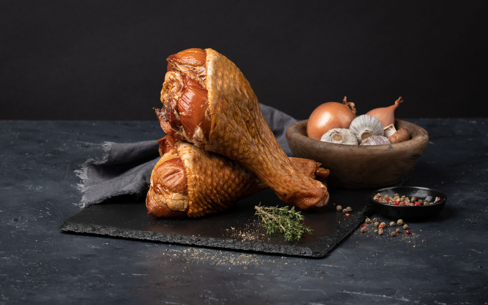 Smoked turkey thigh prepared in the Prominent CZ smokehouse in Brniště. Perfect for immediate consumption if you're looking for something simple to heat up. The turkey meat comes from the Czech Republic, either from the Brniště farm or a farm in South Moravia.